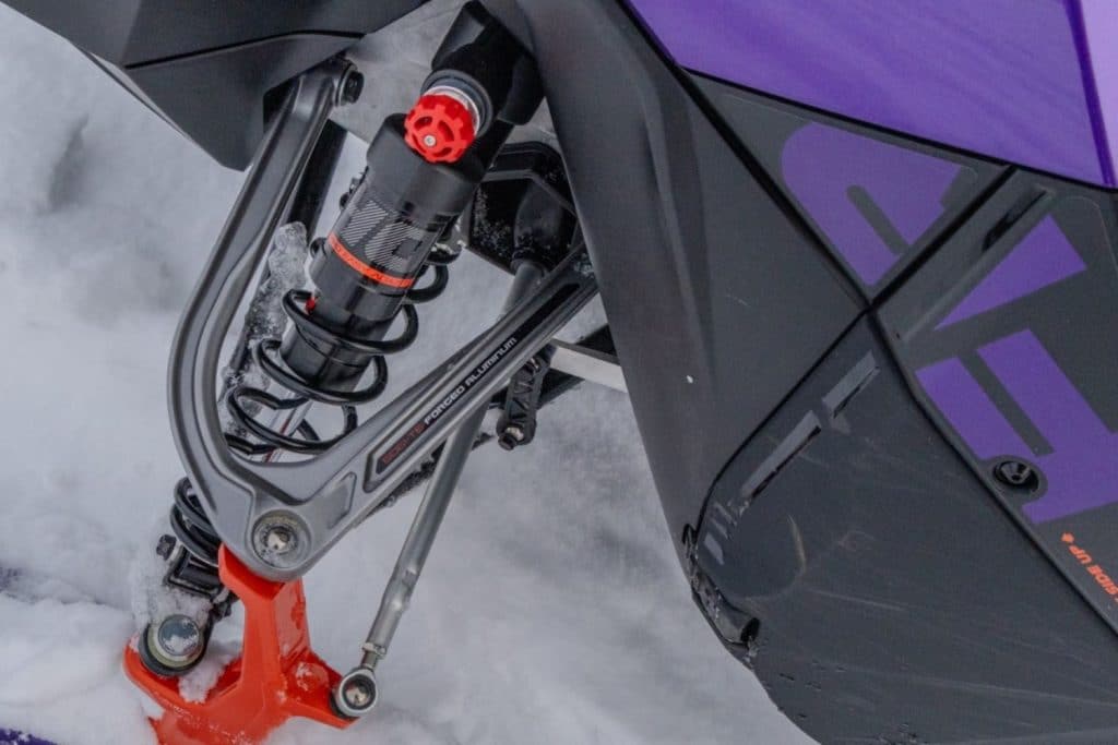 De plus, on a droit à un nouvel écartement de skis de 34 po et au système Twin Link pour la colonne de direction. Un nouveau bloc d’élévation de seulement 90 mm, comparativement à celui de 120 mm. Aussi, les « upper A-arms » deviennent en aluminium forgé. Cette évolution améliore la solidité tout en réduisant la masse non suspendue. Toutes ces améliorations se ressentent dès les premières secondes à son bord. La dynamique de conduite impressionne et la maniabilité se voit grandement améliorée. La 2027 Ski-Doo Freeride bénéficie largement de ses nouveautés pour la rendre hyper précise.